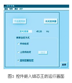 利用bcb中能生成activex控件的項目編寫(xie) 器new-》other-》activex-》activeform,編寫(xie) 相關(guan) 程序實現控製變頻器的功能,並通過bcb自帶的view工具欄中的typelibrary工具來編譯生成控件,此控件經打包可生成在組態王中認始的ocx控件,此控件同樣可設置是否具有可讀可寫(xie) 的屬性,此屬性是在typeliabrary工具中設置編譯後得到的,需要幾個(ge) 參數,其各是什麽(me) 屬性,完全可以自由添加,非常簡單方便。並可通過bcb相關(guan) 程序,設置相關(guan) 屬性對內(nei) 對外的具體(ti) 連接功能。實際上,此過程實現的就是變頻器與(yu) bcb控件的通信,控件與(yu) 組態王的通信,此方式彌補了組態王中不提供的相關(guan) 變頻器等的驅動程序,而無法利用組態王的缺陷,可通過bcb方便實現相關(guan) 功能的驅動,而又間接實現了組態王控製變頻器等的驅動。實際bcb與(yu) 變頻器等的通信也非常簡便,隻要確定了通信協議,就可利用mscomm控件,方便的編寫(xie) 通信程序,實現變頻器等的控製。用bcb製作通用控件嵌入組態王從(cong) 而實現組態王與(yu) 變頻器的通訊,其運行畫麵如圖3所示。
