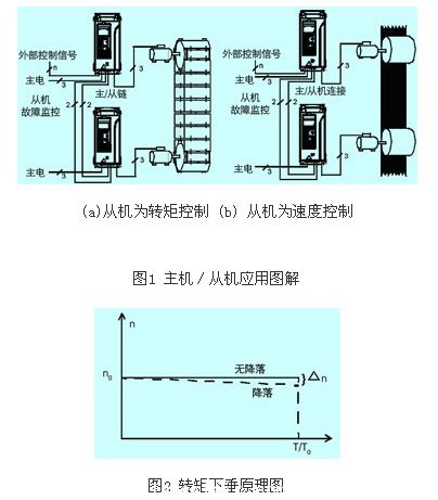 (2)當主機和從(cong) 機的電機軸采用柔性連接時,如圖1(b)所示。從(cong) 機應該采用速度控製方式,在這種情況下,機械結構已經不能保證同步運行的要求,由變頻器組成的傳(chuan) 動係統除了采用速度控製方式解決(jue) 轉速同步問題,同時還要利用轉矩下垂特性實現負載轉矩在各個(ge) 電機上的平均分配。