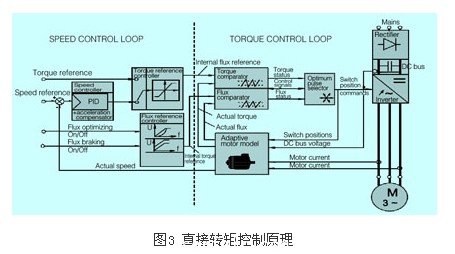 abbacs800係列變頻器主從(cong) 控製采用直接轉矩(dtc)作為(wei) 其核心控製原理。而直接轉矩控製技術是在變頻器內(nei) 部建立了一個(ge) 交流異步電動機的軟件數學模型,根據實測的直流母線電壓、開關(guan) 狀態和電流計算出一組精確的電機轉矩和定子磁通實際值,並將這些參數值直接應用於(yu) 控製輸出單元的開關(guan) 狀態,變頻器的每一次開關(guan) 狀態都是單獨確定的,這意味著可以產(chan) 生實現最佳的開關(guan) 組合並對負載變化作出快速地轉矩響應,並將轉矩相應限製在一拍以內(nei) ,且無超調,真正實現了對電動機轉矩和轉速的實時控製。控製原理如圖3所示。