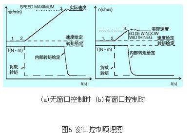 若轉速偏差超出窗口範圍,窗口控製將誤差傳(chuan) 至速度調節器。速度調節器輸出將會(hui) 增加或減少內(nei) 部轉矩給定值,將轉速限製在窗口定義(yi) 的轉速範圍內(nei) 。