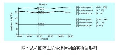 圖7為(wei) 兩(liang) 台電機通過同一個(ge) 減速機同軸聯結(剛性連接)的主從(cong) 波形圖。采用abb傳(chuan) 動調試軟件drivewindow監測主機和從(cong) 機在工作過程中的轉速([1]代表主機,[4]代表從(cong) 機)、電流([2]代表主機,[5]代表從(cong) 機)和輸出轉矩([3]代表主機,[6]代表從(cong) 機)的波形。圖7中的數值為(wei) 相應的實測值。主機給定轉速為(wei) 1480r/min。由圖可見,從(cong) 機跟隨主機的轉矩輸出,兩(liang) 電機分別輸出額定轉矩的約37.4%左右,負載分配基本平衡,兩(liang) 電機實際輸出電流約為(wei) 320a左右。由於(yu) 主從(cong) 機為(wei) 剛性連接,主從(cong) 機轉速由機械結構保持同步,實際轉速為(wei) 1480r/min左右。