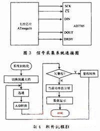 ATmega16對整個(ge) 係統進行控製。通過PB4,PB3狀態控製CD4051的通道選擇;通過SPI口操作AD7705並獲得數據;通過寫(xie) 命令和寫(xie) 數據控製1602液晶的顯示。整個(ge) 係統的軟件流程如圖4所示。