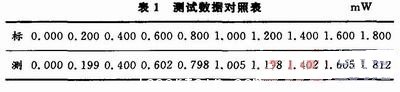 通過實驗室標準光功率計對該光功率計進行了校準,為(wei) 了減小誤差,修正係統的線性度,在數據處理上采用了分段函數法。主要分為(wei) 3段,在不同的階段采用不同的修正係數。表1是係統數據對照表。表中的標指標準光功率計,測指測試光功率計,單位為(wei) mW。由數據可看出,誤差較小,可滿足實驗室的一般實驗需求。