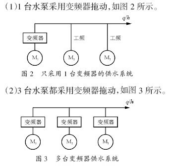 按使用經驗,方案(1)節省初投資,但節能效果差。起動時先起動變頻器至50 Hz 後,再起動工頻,後轉入節能控製。供水係統中隻有采用變頻器拖動的水泵,壓力略小些,係統存在湍流現象,有損耗。