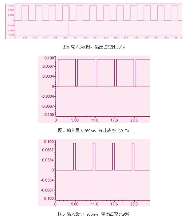 在用新型電流采樣電路設計中,當伺服電機正常工作時,ir2175的輸入為(wei) 正弦電壓信號,po端口輸出頻率為(wei) 130khz、占空比隨電流大小變化的pwm信號(如圖3,4,5),其占空比範圍為(wei) 9%~91%。當采樣電阻上的壓降為(wei) 0時,輸出信號的占空比為(wei) 50%(如圖3所示);當輸入電壓的變化範圍為(wei) -260mv~+260mv時,對應於(yu) 輸出電壓的變化範圍為(wei) 9%~91%。當采樣電阻上的壓降大於(yu) 260mv時,輸出信號的占空比保持最大值91%(如圖4所示);輸入小於(yu) -260mv時,輸出占空比保持最小值9%(如圖5所示)。當采樣電阻上的壓降超過-260mv~+260mv時,ir2175的端輸出一個(ge) 典型值為(wei) 2μs的低電平有效的過流信號。