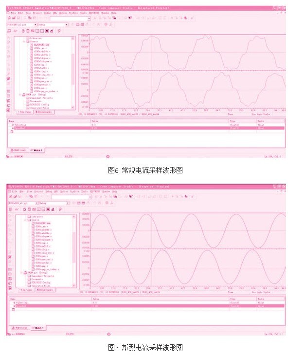 用新型電流采樣電路設計所得到的兩(liang) 路采樣信號波形曲線如圖7所示,其波形十分平滑,可以不加任何處理直接用作電流環閉環。