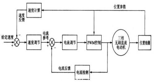 從(cong) 方程可以看到,反電動勢與(yu) 電動機的轉速成比例,而轉矩與(yu) 相電流也幾乎勢成比例的。根據這些特點,在方案中采用了圖3所示的控製策略。給定轉速與(yu) 速度反饋形成偏差,經速度調節後產(chan) 生電流參考量,它與(yu) 電流反饋量的偏差經電流調節後形成PWM占空比的控製量,實現電動機的速度控製。電流的反饋是通過檢測電阻上的壓降來實現的。速度反饋是通過霍爾傳(chuan) 感器輸出的位置量,經過計算得到的。位置傳(chuan) 感器輸出的位置量還用於(yu) 控製換相。