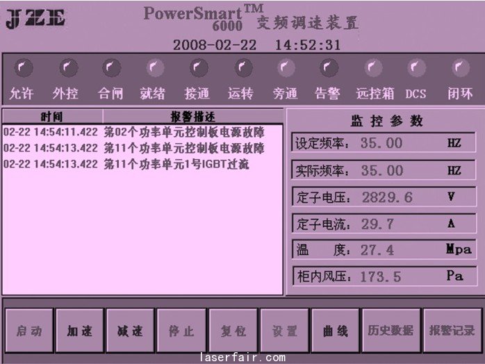 變頻器監控係統主要由工控機、打印機、變頻控製櫃(主要包括plc、模擬量輸入輸出模塊、開關(guan) 量輸入輸出模塊、光纖觸發模塊、ups電源和一些通訊電纜等)組成,其畫麵如圖1所示。工控機作為(wei) 監控中心,將變頻器所有的運行數據和參數利用串行口通訊方式(rs-485),經屏蔽雙絞線送到工控機中,在人機界麵上進行實時顯示;工控機也可下達指令來控製變頻器的啟動、停止、複位等。這樣就完成了對所有數據的采集傳(chuan) 輸及命令傳(chuan) 送,同時,也可完成管理級功能,如局域網的管理任務、形成管理部門所需數據的記錄報表、統計報表等。