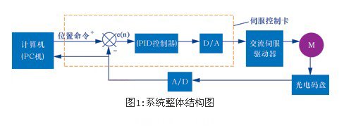 該係統由四部分組成,即微機、伺服控製卡、交流伺服調速係統、傳(chuan) 感檢測。主控微機與(yu) 控製卡相連,可以通過數據線發送位置或速度命令,設定pid調節參數,並進行數模(d/a)轉換,該模擬信號經過交流伺服放大器放大後驅動伺服電動機。電機軸端裝有增量式光電碼盤,通過光電碼盤提供反饋信號(a、b、in脈衝(chong) )來完成位置伺服係統的位置反饋,組成一個(ge) 半閉環係統。一般將光電碼盤裝在電機非負載軸的軸端上,便於(yu) 安裝和避免機械部件振動和變形對位置控製係統產(chan) 生不利影響。位置反饋環中傳(chuan) 感元件—增量式光電編碼器將運動構件實時的位移(或轉角)變化量以a、b相差分脈衝(chong) 形式長線傳(chuan) 輸到現場控製站(pc機)中進行編碼器脈衝(chong) 計數,以獲得數字化位置信息,主控微機機算給定位置與(yu) 實際位置(即反饋到的位置)的偏差後,根據偏差範圍采取相應的pid控製策略,將數字控製作用經數模轉換變成模擬控製電壓,並輸出給伺服放大器,最終調節電機運動,完成期望值的定位。