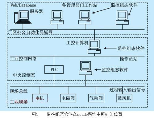 在一個(ge) 自動監控(supervisory control and data acquisitionscada)係統中,投入運行的監控組態軟件是係統的數據采集和處理中心、遠程監控中心和數據轉發中心。處於(yu) 運行狀態的監控組態軟件與(yu) 各種控製、檢測設備如掛接在現場總線上的工控計算機、plc、智能儀(yi) 表、智能設備等共同構成快速響應控製中心。控製方案和算法一般在設備上組態並執行,也可在工控計算機上組態,然後在下裝到設備中執行,根據設備的具體(ti) 要求而定[1]。組態軟件在scada係統中所處的位置如圖1所示。