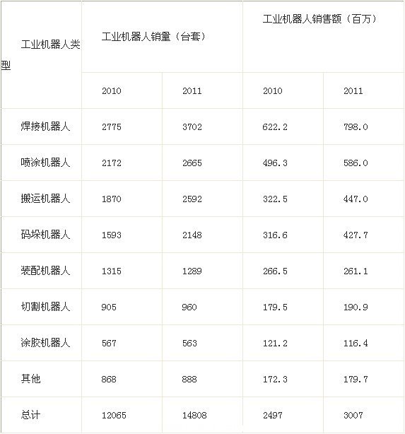 工業(ye) 機器人主要應用在汽車及零配件等行業(ye) ,汽車及配件行業(ye) 2010年的增長率都在30%以上,且國內(nei) 多個(ge) 汽車生產(chan) 廠家擴建了廠房或增建了新廠,采購了大量的機器人。