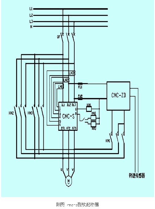 當設置完參數後,機床主軸電機可在設定時間內(nei) ,從(cong) 零轉速到額定轉速無級平滑地起動。起動完畢後,軟起動器停止輸出,旁路接觸器閉合(正、反轉通過旁路兩(liang) 個(ge) 接觸器km2、km3實現)。此時軟起動器轉為(wei) 監控狀態,對主軸電機運行進行保護。