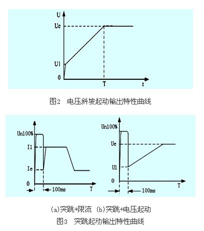 圖3給出了突跳起動模式的輸出變化波形,在某些重載場合下,由於(yu) 機械靜摩擦力的影響而不能起動電機時,可選用此種起動模式。在起動時,先對電動機施加一個(ge) 較高的固定的電壓並持續有限的一段時間,以克服電動機負載的靜摩擦力使電機轉動,然後按限製電流或電壓斜坡的方式起動。在選用此模式前,應先用非突跳模式起動電機,若電機因靜摩擦力太大不能轉動,再選用此模式,否則應避免用此模式起動,以減少不必要的大電流衝(chong) 擊。