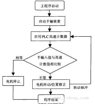 程序設計方案為(wei) 手動輸入一個(ge) 角度值,讓電機轉動,通過與(yu) 電動機相聯的光電碼盤來檢測電動機轉的角度,將轉動角度變成脈衝(chong) 信號。由於(yu) 電動機的轉速非常快,所以隻能把脈衝(chong) 信號送往PLC的高速計數器。然後將計數器的脈衝(chong) 記錄與(yu) 手輸入的進行比較,如果兩(liang) 者相等說明電動機已經到達指定角度位置,否則繼續進行修正。值得注意的是,由於(yu) 電動機從(cong) 轉動突變到停止會(hui) 有一定的慣性,因此在進行信號比較時應允許有一定的誤差,不然電動機就會(hui) 始終處在修正位置狀態。係統程序框圖如圖3所示。