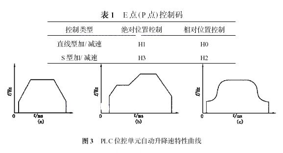 本研究所利用的PLC 係統的組成包括如下七大模塊:電源,CPU ,位控單元, I/ O 單元,A/ D ,D/ A 單元。 其中位控單元的主功能是當步進電機(或伺服電機) 與(yu) 電機驅動器聯結時,輸出脈衝(chong) 序列控製電機的轉速與(yu) 轉角。 進給機構可以是2 軸型,也可以是4 軸型。 本文采用的是前者,即滾珠絲(si) 杠的橫向進給與(yu) 縱向進給,如圖2所示。 具體(ti) 地說,位控單元實現速度以及位置的控製方法有多種,如E 點控製(單速度控製) ,如圖3(a) 所示;P 點控製(多級速度控製) ,如圖3 (b) 所示; 線性加/ 減速和S型加/ 減速,圖3 ( a ) , ( b)為(wei) 線性加/ 減速,S型如圖3 (c) 所示。 除此之外還有絕對位置控製和相對位置控製等。 表1 給出了E點控製不同模式的控製碼(P 點與(yu) 其相同) 。
