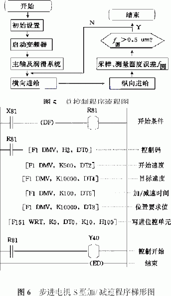 如圖4 所示, PLC 可以控製變頻器、傳(chuan) 感器、步進電機。 總控製程序流程圖如圖5 所示。 其中兩(liang) 個(ge) 步進電機是利用PLC 的位控單元控製的。 在進行精密磨削過程中,橫向進給將是十分重要的,PLC 的位控單元能較精確地控製步進電機的轉角,從(cong) 而使滾珠絲(si) 杠獲得精確定位。 由於(yu) PLC 位控單元的控製方法有多種,對於(yu) 磨削加工來講,橫向進給量不能大於(yu) 215μm ,通過實驗的方法可以找出最佳方案。 這裏隻通過一種控製方法來說明位控單元的具體(ti) 應用。 首先,設置原點,利用光柵尺粗對刀,測量出對刀位置距原點的距離。 為(wei) 防滾珠絲(si) 杠出現爬行現象,工作台從(cong) 原點出發,經過一段距離以後開始自動加/ 減速。 此時,隻要給定起始速度,目標速度,加速/ 減速時間以及位置要求值,並設定控製碼即可實現上述功能,相關(guan) 程序如圖6 所示。 如果假設滾珠絲(si) 杠的螺距為(wei) d ,步進電機的步距角為(wei) α°;進給速度為(wei) v (mm/ s) ;行程為(wei) s (mm) ;則要求的脈衝(chong) 頻率(即程度中的目標速度) 為(wei) f = 360 v/αd (Hz) ;總脈衝(chong) 數(即程序中的位置要求值) 為(wei) F =360s/da(個(ge) ) 。