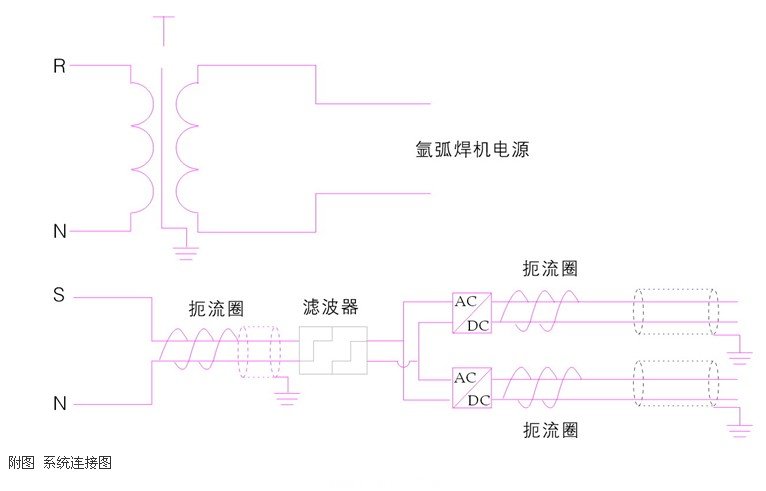 在本案例中,氬弧焊機電源與(yu) 伺服驅動器供電電源分別供給。氬弧焊機電源用隔離變壓器隔離,伺服電源線外套一個(ge) 扼流圈後送入有源功率濾波器,經過濾波後,再送至開關(guan) 電源。伺服驅動器的動力電源和控製電源用2個(ge) 開關(guan) 電源分別供電,且在接入驅動器前分別套一個(ge) 扼流圈。驅動器電源與(yu) 控製(編碼器)電源均連接了屏蔽線,並確保單端可靠接地。如附圖為(wei) 係統接線圖。