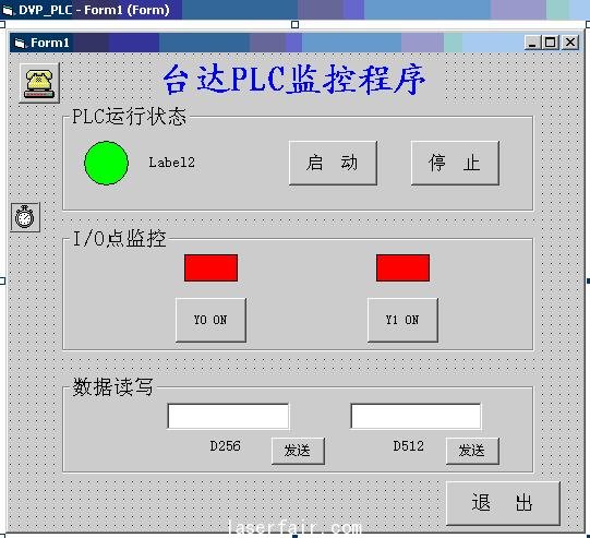 用按鈕控製PLC的起動停止,Y0、Y1的ON/OFF及D256、D512寫(xie) 完數據的發送;用Shape組件做指示燈,表示PLC的運行狀態和Y的狀態;用timer組件不停的讀取M1072的狀態,以判斷PLC的運行情況;用MScomm控件實現PC與(yu) PLC的通信。