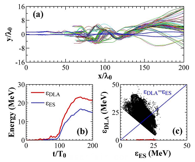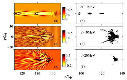 圖4.模擬顯示團簇使DLA機製得以激發,電子從(cong) 橫向獲得能量和很大波蕩幅度,利於(yu) betatron輻射產(chan) 額的提升