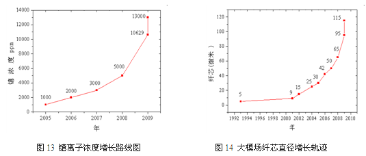 烽火通信采用自主知識產(chan) 權的專(zhuan) 利技術,實現了稀土離子摻雜技術突破,鐿離子濃度迅速突破13000ppm(見圖13所示),雙包層摻鐿光纖的纖芯直徑迅速突破100微米的技術關(guan) 隘,達到115微米(見圖14所示)。