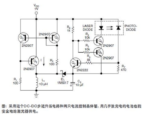 如果激光筆發射出的光線超過一定級別,無論是直接或者經過光亮物體(ti) 反射後進入人眼,即使是很短的時間,也會(hui) 對人眼造成傷(shang) 害。所以,多數國家都製定有激光安全要求,限定了最大發射水平。本設計實例描述了一種激光驅動器,它甚至在一隻1.5V電池放電到1V時也能工作,用兩(liang) 隻電流控製晶體(ti) 管改善了在電量不足情況下的可靠性,並且允許過強的激光電流與(yu) 發光。