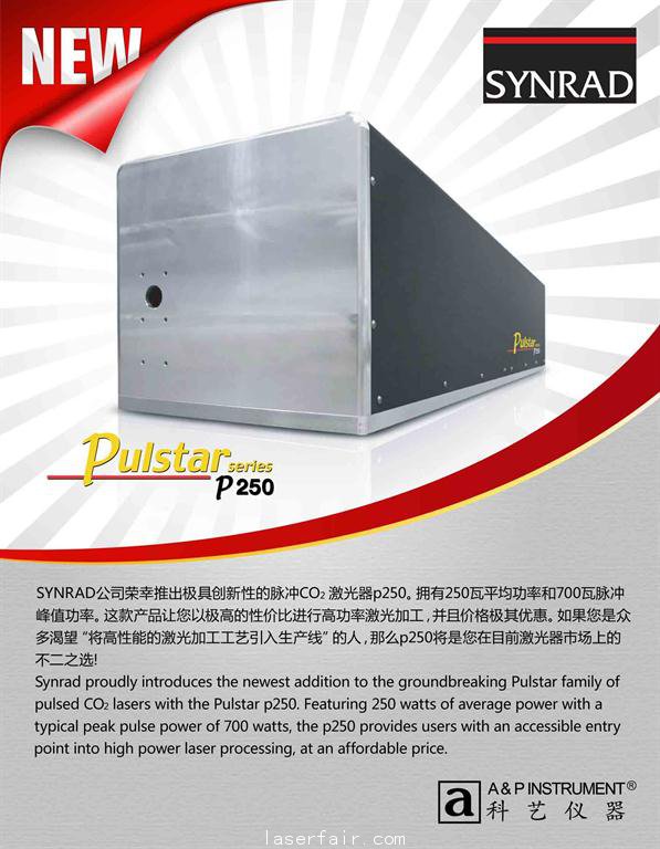 SYNRAD公司榮幸推出極具創新性的脈衝(chong) CO2激光器p250。擁有250瓦平均功率和700瓦脈衝(chong) 峰值功率,這款產(chan) 品讓您以極高的性價(jia) 比進行高功率激光加工。
