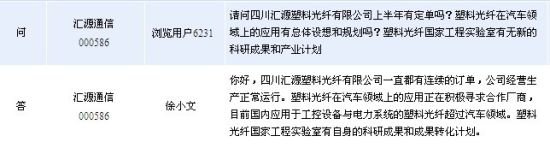 匯源通信(5.57,0.05,0.91%)(000586)周三在全景網互動平台上表示,公司子公司四川匯源塑料光纖有限公司一直都有連續的訂單,公司經營生產(chan) 正常運行。