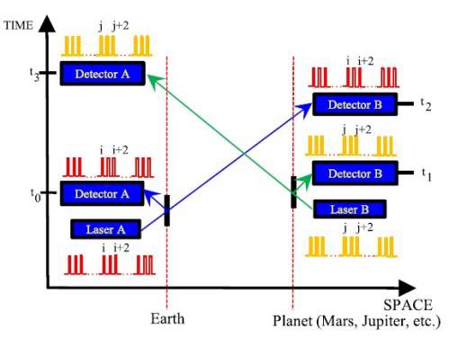 主動激光測距地球和行星之間的空間 - 時間圖。該係統收發器兩(liang) 端均采用有源激光器,所以比無源收發器的信號更強,可以實現遠距離激光測距。