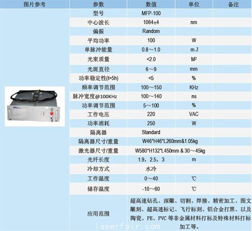 聲光調Q脈衝(chong) 光纖激光器具有開機時間短,光脈衝(chong) 窄,高峰值功率,重複頻率範圍寬等特點,極大滿足用戶的需求。創鑫激光采用最可靠的設計方案研製出了平均功率高達100W的聲光調Q脈衝(chong) 光纖激光器。該激光器在激光關(guan) 斷情況下無漏光,工作波長穩定在1064+4nm,功率可調範圍5%-100%,脈衝(chong) 重複頻率100-----150KHZ,寬度可調範圍100ns-140ns,並實現高達10KW的峰值功率輸出,可用於(yu) 鋁,銅,金,銀等反高材料上進行加工。此激光器結構緊湊,冷卻方式為(wei) 水冷,可靠性強,使用壽命長,廣泛應用於(yu) 超高速鑽孔、深雕、切割、焊接、精密加工、圖文雕刻、超高速標記、飛行標刻、非金屬材料打標及特殊材料打標加工等。