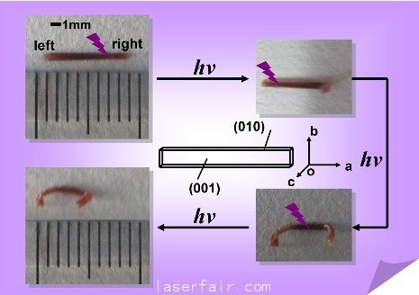 能量輸入誘導做功是一個(ge) 廣泛研究的重要科學問題。麵對日益嚴(yan) 重的環境汙染,如何有效利用可再生能源來實現能量到功的轉化激發了科學家對新興(xing) 能量轉換材料研究的興(xing) 趣。光誘導形變材料由於(yu) 具有遠程、快速以及空間可探測的特點,能有效地將光能轉化為(wei) 機械能,從(cong) 而在光做功領域具有重要的潛在應用。目前為(wei) 止,雖有為(wei) 數不多的具有這類形變的晶體(ti) 材料被報道,但是它們(men) 的形變尺寸還都停留在納米以及微米級別,這樣小的晶體(ti) 尺寸極大地限製了其實際應用。