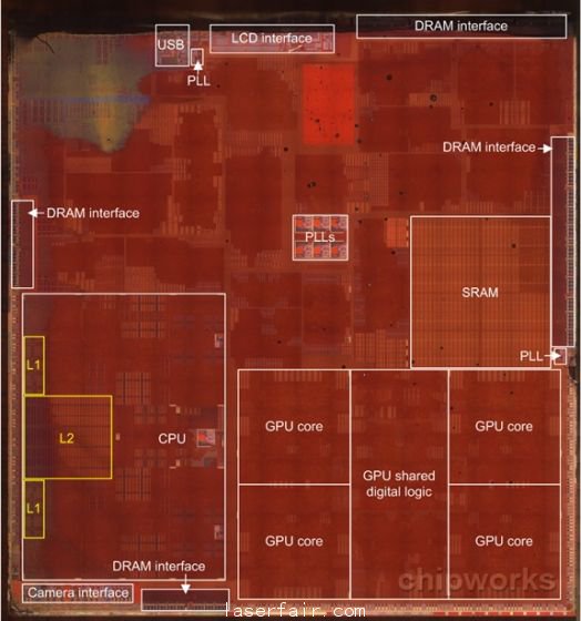 分析顯示,在公布的照片中,CPU部分位於(yu) 芯片左下角,而四核GPU位於(yu) 右下角。AnandTech此前的分析顯示,這一圖形模塊采用了Imagination Technologies的PowerVR G6430。