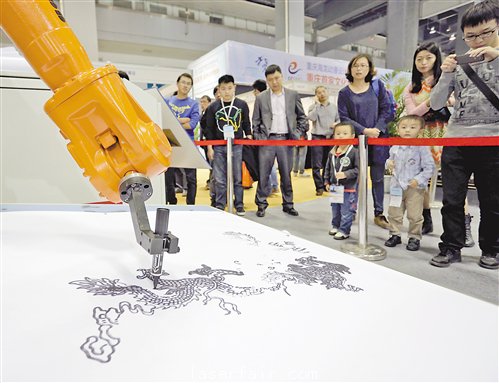 10月25日,南坪會(hui) 展中心展會(hui) 現場,工業(ye) 機器人正在“作畫”,一條栩栩如生的龍躍然紙上