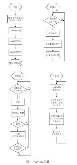 係統軟件主要分為(wei) 三個(ge) 部分:Modbus RTU 通信處理程序,負責和HMI的通信;操作流程控製,瞬變脈衝(chong) 的輸出;數字輸入和輸出量的處理;STM32的內(nei) 部資源、FLASH 容量和SRAM 容量都比51 單片機要豐(feng) 富,對於(yu) 本係統,非常適合用實時操作係統進行軟件的編寫(xie) ,所以本係統采用了Keil自帶的RTX實時操作係統,共開啟了4個(ge) 進程:Task_init(),Task1_Modbus(),Task2_Laser-CTL()和Task3_IO();基本軟件流程圖如圖2所示。