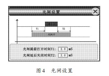 在圖3觸摸屏界麵中,點擊“光閘設置”可以進入光閘控製的設置界麵,如圖4所示,智能光閘控製,ms級時間內(nei) 的延遲時間可根據需求定製,保證完全遮光,功能穩定,而且操作界麵顯示和設置都非常友好方便。