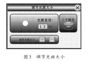 圖3 顯示的是係統搭建完成後液晶控製觸摸屏上顯示調節光斑直徑的界麵。在該界麵上通過增、減調節,在上、下限範圍內(nei) 設置光斑直徑的實際值。內(nei) 部是通過控製步進電機調整透鏡位置,調整激光焦距,從(cong) 而使光斑直徑發生改變。
