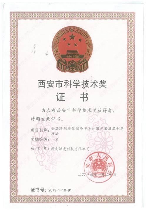 “疊層陣列液體(ti) 製冷半導體(ti) 激光器及其製備方法”獲西安市科學技術獎壹等獎