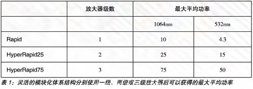第三種方法是使用半導體(ti) 泵浦固態振蕩器,這種方法可以產(chan) 生更高的脈衝(chong) 能量。然後是自由空間放大器,通常是再生放大器或多級放大器。事實上,可以使用多個(ge) 放大器階段來把功率提升到更高水平。例如,Coherent公司2012年收購Lumera Laser公司後獲得的產(chan) 品就是在Nd:YVO4種子源後加入了一個(ge) 或多個(ge) 放大器,使Lumera激光器的脈衝(chong) 能量高達200μJ(在1064nm)。表1總結了靈活的模塊化體(ti) 係結構分別使用一級、兩(liang) 級或三級放大器後可以獲得的最大平均功率。