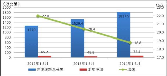 據工信部披露的2014年3月份通信業(ye) 經濟運行情況,今年前三個(ge) 月,全國新建光纜線路長度再創新高,新建光纜中本地網光纜比重居首。