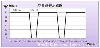 采用全金錫焊料封裝HCS02係列產(chan) 品非常適用於(yu) 工業(ye) 和科研領域,尤其是在硬脈衝(chong) (hard pulse-on and off operation)工作條件下的應用。如圖2和圖3所示,西安炬光科技有限公司研發的FL-HCS02-50-825產(chan) 品在25度,恒流60A下以90s開、30s關(guan) 的條件進行壽命測試,結果顯示壽命測試時間已經突破了8000h。這種hard pulse on and off模式非常考驗產(chan) 品的抗熱疲勞效應,如果是采用銦焊料(或者其他soft solder)進行焊接,極容易被這種hard pulse 條件破壞焊料層,形成銦焊料的失效,進而導致產(chan) 品失效。而采用全金錫焊料封裝的FL-HCS02-50-825完全可以從(cong) 根本上解決(jue) 這一問題。