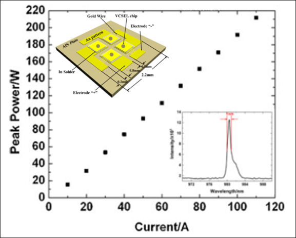 中國科學院長春光學精密機械與(yu) 物理研究所大功率激光研究組開發出了利用4個(ge) 高功率垂直腔麵發射半導體(ti) 激光器(VCSEL)單管串接形成的百瓦級980nm波段高功率準列陣模塊。該模塊采用全自主化設計的芯片結構及模塊結構,模塊尺寸僅(jin) 有2.2mmX2.2mm,輸出功率高達210W,這是單管VCSEL模塊迄今為(wei) 止所報道的最高功率指標。該突破使得微小型高功率VCSEL模塊有望在激光引信、激光測距及激光麵陣雷達係統中實現實用化。該成果已正式發表(JJAP 53,070303,2014),並得到了國際光電類期刊Semiconductor TODAY 的關(guan) 注。