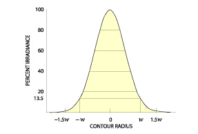 這裏的w=w(z)和P是光束的總功率,在所有的相交的部分是等值的。分布形式的恒定性是對在z=0的時候高斯分布預測的特殊結果。如果統一的發光分布在z=0時刻被預測,z=∞時刻的形式將與(yu) 貝塞爾公式給出的艾利斑(Airy disc)形式相似,這裏z值中間的形式將變得非常複雜。