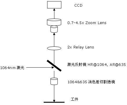 激光1064nm通過兩(liang) 麵拋光的反射鏡折射到下部,經過聚焦作用在工件上。可見光通過反射鏡透射到上部,經過relay透鏡將工件聚焦,經過一個(ge) CCD的可調物鏡將工件成像在CCD的焦麵上。