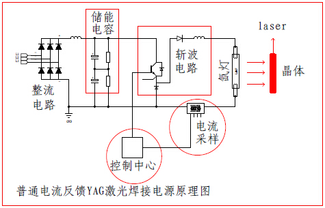1、三相電網電壓輸入整流,經儲(chu) 能電容,直接斬波輸出脈衝(chong) 能量給氙燈,用以泵浦YAG晶體(ti) 產(chan) 生激光輸出;