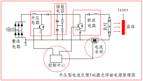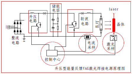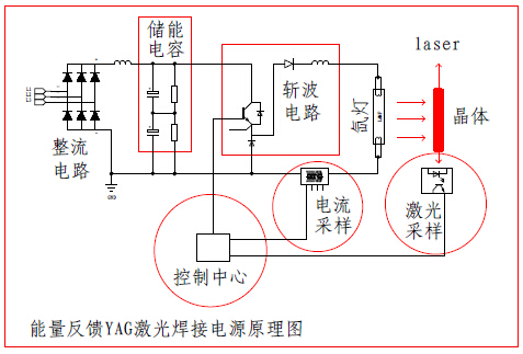 1、三相電網電壓輸入整流,增加升壓電路,經儲(chu) 能電容,斬波輸出脈衝(chong) 能量給氙燈,用以泵浦YAG晶體(ti) 產(chan) 生激光輸出;