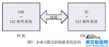 鑒於(yu) D-M-I模式相對於(yu) M-I模式的數控機床在線測量係統具有更高的精度和靈活性,針對結構複雜零件的加工、測量與(yu) 修整,我們(men) 采用了D-M-I模式的數控機床在線測量與(yu) 加工,以提高測量、加工精度。將PC機與(yu) 數控機床相連,在PC機上主要完成CAD係統與(yu) CAI軟件係統的集成,在數控機床上完成NC係統與(yu) CAI的硬件係統集成,從(cong) 而實現CAD/NC/CAI的集成,係統結構如圖7所示。