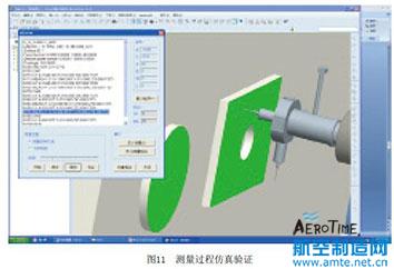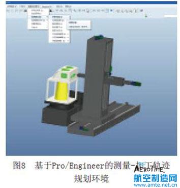 該機床在線測量係統的操作步驟為(wei) :操作者首先向虛擬數控操作環境中加載目標零件模型;隨後進行虛擬操作環境初始化操作,其目的是建立虛擬操作環境下裝配坐標係與(yu) 實際機床坐標係之間的關(guan) 係、各運動部件的變換矩陣;最後,操作人員根據功能菜單選擇進行測量麵選擇、測量路徑規劃、測量過程仿真等操作。當需要修改被加工(測量)的零件時,隻需將虛擬環境下的該零件激活,修改完成之後將整個(ge) 虛擬環境重新激活,便可重新對其進行操作。該係統將CAI操作軟件通過二次開發技術集成到Pro/Engineer環境下,使得CAD係統與(yu) CAI係統實現無縫連接。基於(yu) Pro/Engineer的虛擬測量環境構建,可實現實際操作過程的模擬,對測量或加工過程進行可靠性驗證,如圖11所示。