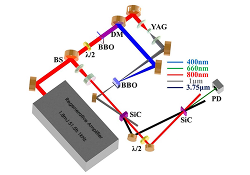 針對4H-SiC晶體(ti) 的特點及中紅外飛秒激光的發展需求,在2013年合作的基礎上,光物理重點實驗室L07組的博士生範海濤、副研究員王兆華和先進材料與(yu) 結構分析實驗室A02組的博士生徐春華、副研究員王剛等人進一步合作,改用L07組自建的飛秒鈦寶石激光放大器作為(wei) 泵浦激光、A02組新生長的高質量4H-SiC晶體(ti) 作為(wei) 非線性晶體(ti) ,通過飛秒激光參量放大研究獲得了能量大幅度提高的寬帶中紅外激光輸出。實驗中他們(men) 將鈦寶石放大器輸出的激光分為(wei) 三部分(圖1),一部分用於(yu) 產(chan) 生穩定的單絲(si) 白光超連續;另一部分倍頻後泵浦BBO晶體(ti) 放大白光超連續中波長1μm的成分;第三部分泵浦4H-SiC晶體(ti) 繼續放大1μm信號光的同時,獲得了中心波長3.75μm、單脈衝(chong) 能量17μJ、能量穩定性優(you) 於(yu) 1.5%的中紅外閑頻光。實驗中采用理論計算獲得的最佳非共線角(2.3°)使得晶體(ti) 中信號光與(yu) 閑頻光很好地滿足群速匹配,獲得了半高寬550nm的超寬帶閑頻光光譜(圖2),支持56 fs的傅裏葉極限脈衝(chong) ,實驗測量結果表明實際的激光脈寬為(wei) 70fs。相比2013年的結果,不僅(jin) 單脈衝(chong) 能量提高了近兩(liang) 個(ge) 量級,而且脈衝(chong) 寬度也僅(jin) 6個(ge) 光學振蕩周期左右。相關(guan) 結果發表在Optics Letters後,進一步入選Spotlight on Optics焦點關(guan) 注文章 (Highlighted Articles from OSA Journals)。