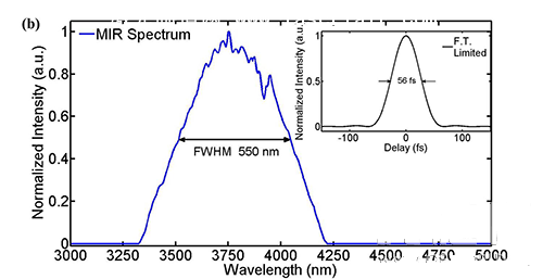 圖2 中紅外激光光譜及對應的傅裏葉極限脈衝(chong) 圖