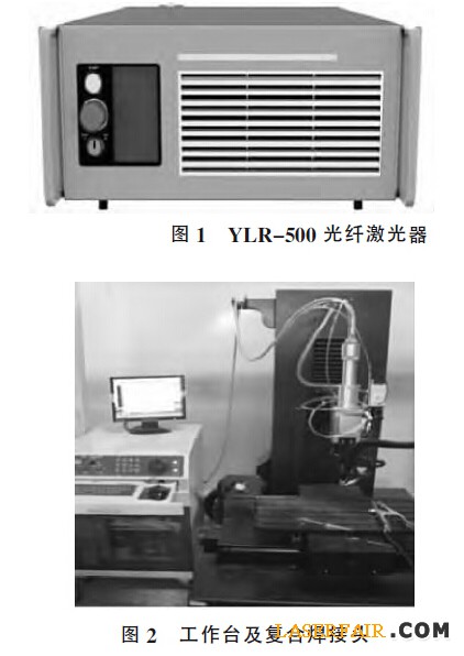 試驗采用德國IPG 公司生產的YLR-500 單模光纖激光器,如圖1 所示,激光功率500 W,TIG焊接機采用日本鬆下TIG 焊機,並使用自製的激光-TIG複合焊頭及三維工作平台進行焊接試驗,工作台及複合焊頭如圖2 所示。