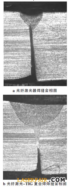 光纖激光器是一種高光束質量的光源,相對於傳統激光光源,光纖激光器的光斑更小,在焊接有間隙的工件時,對工件間隙的敏感程度更高。在有間隙情況下光纖激光器以及光纖激光-TIG 複合焊焊縫的金相對比如圖3 所示。